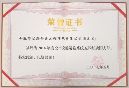首頁 > 新聞中心 > 詳細新聞    近日,合肥市交通局對2016年度全系統(tǒng)優(yōu)秀團支部進行了表彰,合肥路橋公司團支部榮獲“五四紅旗團支部”稱號。