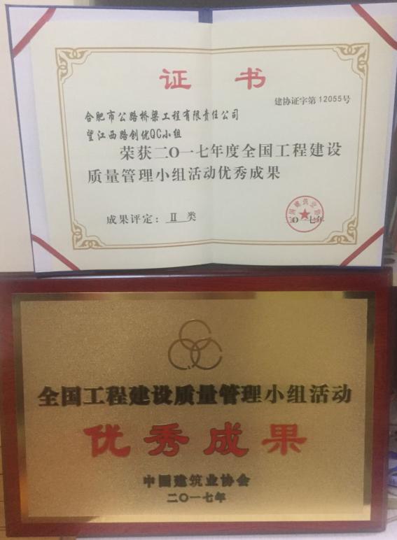 首頁 > 新聞中心 > 詳細(xì)新聞   近日,2017年度中國建筑業(yè)協(xié)會及全國市政工程建設(shè)協(xié)會優(yōu)秀QC小組成果發(fā)布會在四川省成都市相繼召開。經(jīng)專家評審,合肥路橋公司第一分公司編寫的《提高鋼帶增強(qiáng)聚乙烯螺旋波紋管接頭連接合格率》榮獲全國工程建設(shè)質(zhì)量管理小組優(yōu)秀成果二等獎和全國市政工程建設(shè)優(yōu)秀質(zhì)量管理小組三等獎;此外,由公司第六分公司編寫的《提高強(qiáng)風(fēng)化花崗巖路基回填質(zhì)量》榮獲全國市政工程建設(shè)優(yōu)秀質(zhì)量管理小組三等獎。