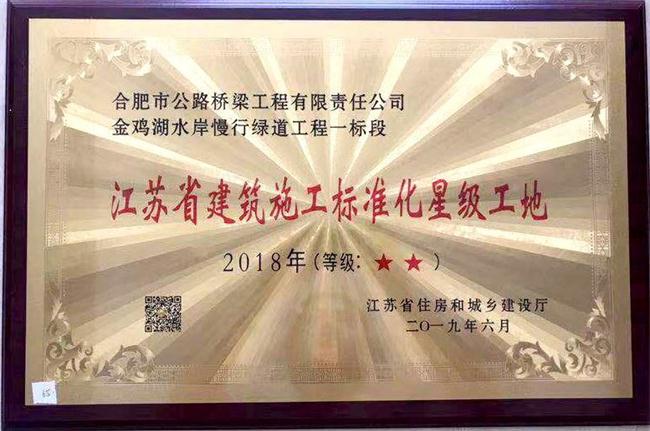 首頁(yè) > 新聞中心 > 詳細(xì)新聞近日,在江蘇省住房和城鄉(xiāng)建設(shè)廳公布的關(guān)于2018年江蘇省建筑施工標(biāo)準(zhǔn)化星級(jí)工地項(xiàng)目名單中,我公司承建的金雞湖水岸慢行綠道工程一標(biāo)段榮獲“江蘇省建筑施工標(biāo)準(zhǔn)化星級(jí)工地”榮譽(yù)稱號(hào)。