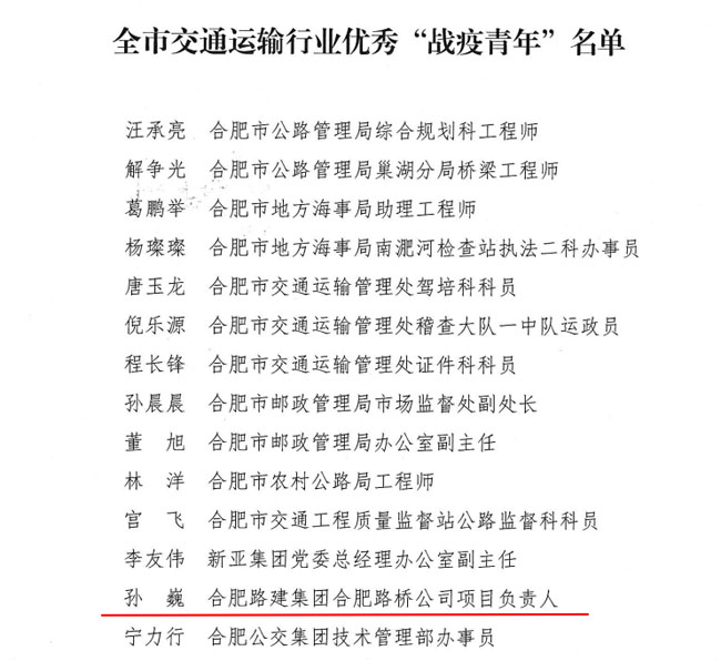 首頁 > 新聞中心 > 詳細(xì)新聞6月2日,在市交通運輸局黨組發(fā)布的30名全市交通運輸行業(yè)優(yōu)秀“戰(zhàn)疫青年”名單中,合肥路橋?qū)O巍同志獲“戰(zhàn)疫青年”榮譽(yù)稱號。
