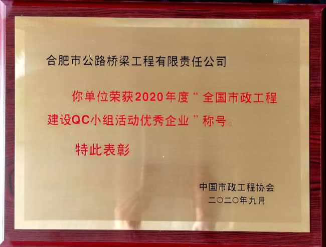 首頁 > 新聞中心 > 詳細新聞2020年度全國市政工程建設(shè)優(yōu)秀QC小組活動成果發(fā)布會于2020年8月25日至27日在浙江杭州、9月23日至25日在安徽合肥分兩批次召開,合肥路橋再次榮獲2020年度“全國市政工程建設(shè)QC小組活動優(yōu)秀企業(yè)”稱號。
