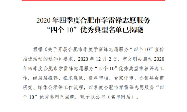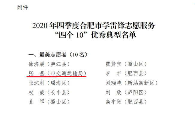 首頁(yè) > 新聞中心 > 詳細(xì)新聞1月25日,在市文明辦啟動(dòng)的 2020 年四季度合肥市學(xué)雷鋒志愿服務(wù)“四個(gè) 10”優(yōu)秀典型推薦評(píng)選工作中,合肥路橋張燕同志以突出的表現(xiàn)榮獲最美志愿者稱號(hào)。