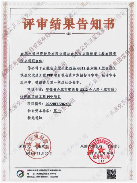首頁 > 新聞中心 > 詳細(xì)新聞奮楫揚帆正當(dāng)時,喜報頻傳振人心!2022年12月30日,合肥路橋與合肥交投以聯(lián)合體形式成功取得G312合六路(肥西段)快速化改造工程PPP項目社會資本方評選“第一名”,確定為中標(biāo)人,為合肥路橋2022年經(jīng)營工作畫上濃墨重彩的一筆。