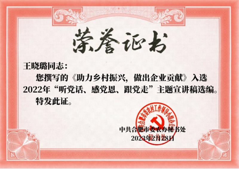 首頁(yè) > 新聞中心 > 詳細(xì)新聞近日,由市委農(nóng)辦、市委宣傳部等七部門(mén)聯(lián)合舉辦的“聽(tīng)黨話、感黨恩、跟黨走”主題教育活動(dòng)宣講稿選編結(jié)果正式揭曉。合肥路橋王曉璐同志撰寫(xiě)的《助力鄉(xiāng)村振興,做出企業(yè)貢獻(xiàn)》成功入選。
