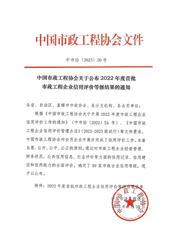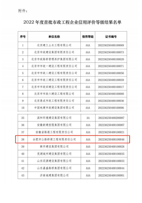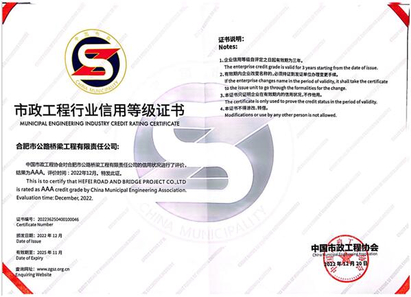 首頁(yè) > 新聞中心 > 詳細(xì)新聞近日,從中國(guó)市政工程協(xié)會(huì)獲悉,2022年度首批市政工程AAA級(jí)信用企業(yè)名單揭曉,合肥路橋憑借良好的生產(chǎn)經(jīng)營(yíng)業(yè)績(jī)、健全的企業(yè)管理體系和豐碩的誠(chéng)信建設(shè)成果成功上榜。