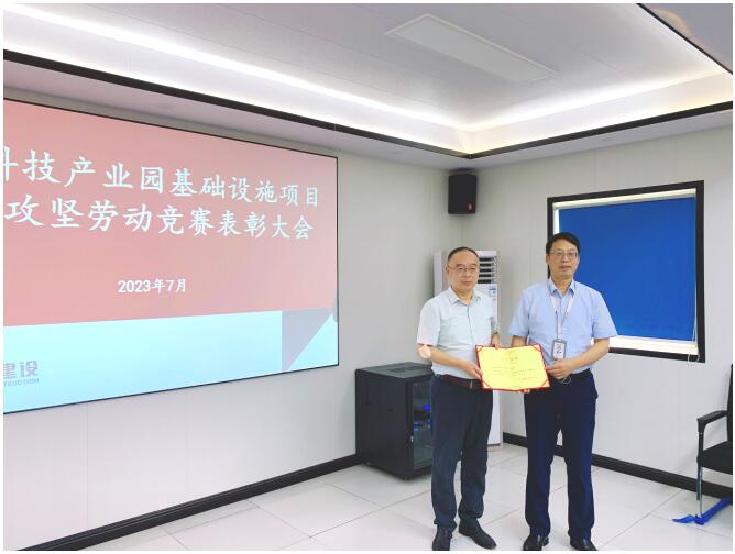 7月27日下午,金光科技產(chǎn)業(yè)園基礎(chǔ)設(shè)施項(xiàng)目“百日攻堅(jiān)”勞動(dòng)競(jìng)賽表彰大會(huì)順利召開,恒泰建設(shè)黨支部書記、執(zhí)行董事唐國(guó)臣向獲獎(jiǎng)單位頒發(fā)榮譽(yù)證書,合肥路橋董事長(zhǎng)楊楓代表公司上臺(tái)領(lǐng)獎(jiǎng)并做獲獎(jiǎng)發(fā)言。