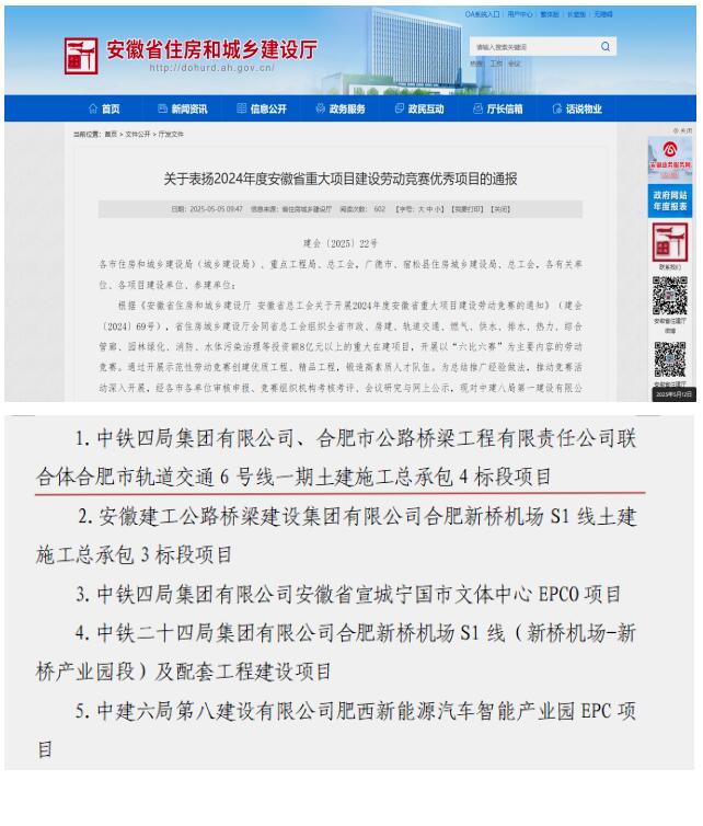 首頁 > 新聞中心 > 詳細(xì)新聞日前,安徽省住房和城鄉(xiāng)建設(shè)廳、安徽省總工會聯(lián)合通報表揚(yáng)2024年度安徽省重大項(xiàng)目建設(shè)勞動競賽優(yōu)秀項(xiàng)目,合肥路橋、中鐵四局集團(tuán)聯(lián)合承建的合肥市軌道交通6號線一期土建施工總承包4標(biāo)段項(xiàng)目榮獲2024年度安徽省重大項(xiàng)目建設(shè)勞動競賽優(yōu)秀項(xiàng)目。