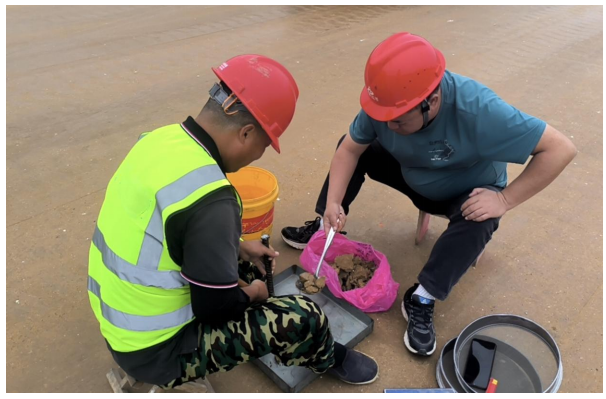 淮桐1標現(xiàn)場檢測員正在進行壓實度檢測。